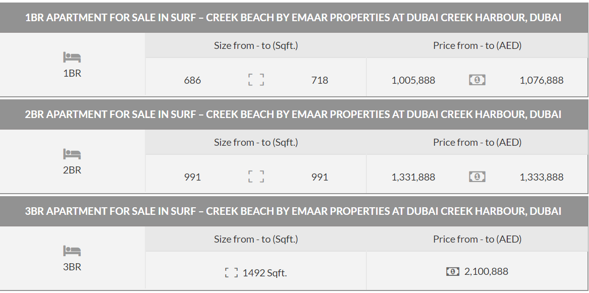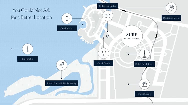 Surf Creek Beach by Emaar is an elegant apartment in Dubai Creek Harbour comprising of spacious 1BR, 2BR & 3BR units, near to the dazzling plaza & minutes away from Creek Marina.