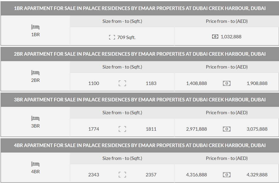 Palace Residences is a recently established splendid & stunning hospitality driven residential development by Emaar Properties featuring spacious and commodious 1BR, 2BR, 3BR & 4BR apartments with the finest set of amenities and an exceptionally central location in Dubai Creek Harbour. Palace Residences is a residential development situated adjacent to the famous The Palace Hotel and is a joint endeavor of the globally renowned The Address Hotels & Resorts in the scenically heavenly development of Dubai Creek Harbour designed and dedicated for an extremely spacious and commodious lifestyle. Palace Residences is the residential part of it, offering 1BR, 2BR, 3BR, 4BR apartments adorned by the finest of maestros and provided with the best amenities around.