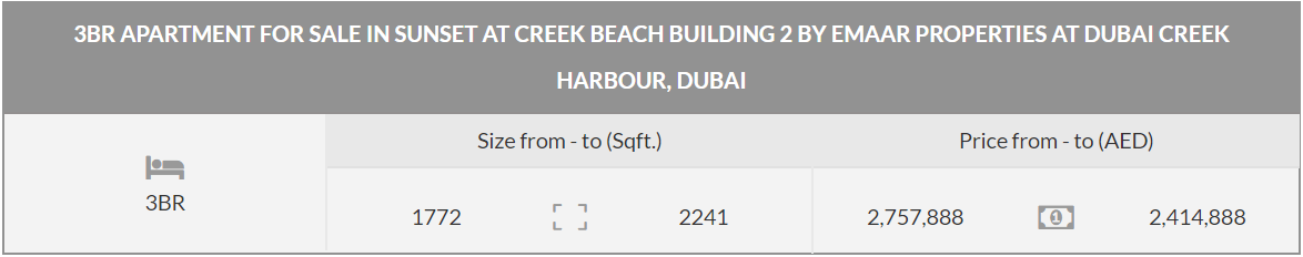 In terms of its location, Sunset Creek Beach Building 2 enjoys the most perfect address. Located on Dubai Creek Harbour, the residential development has close access to almost all the key locations of the city i.e. Downtown Dubai, Dubai International Airport etc. Due to its close access to Dubai Metro, the residents can also commute conveniently even if they don’t own their private vehicles.