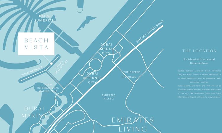 The location of Beach Vista Tower 2 can be easily accessed via King Salman bin Abdulaziz Al Saud Street (which was formerly known as Al Sufouh Road) and Sheikh Zayed Road. A monorail system will also be designed to be established in the area in the future, which will allow anyone to take a tour around the island conveniently.