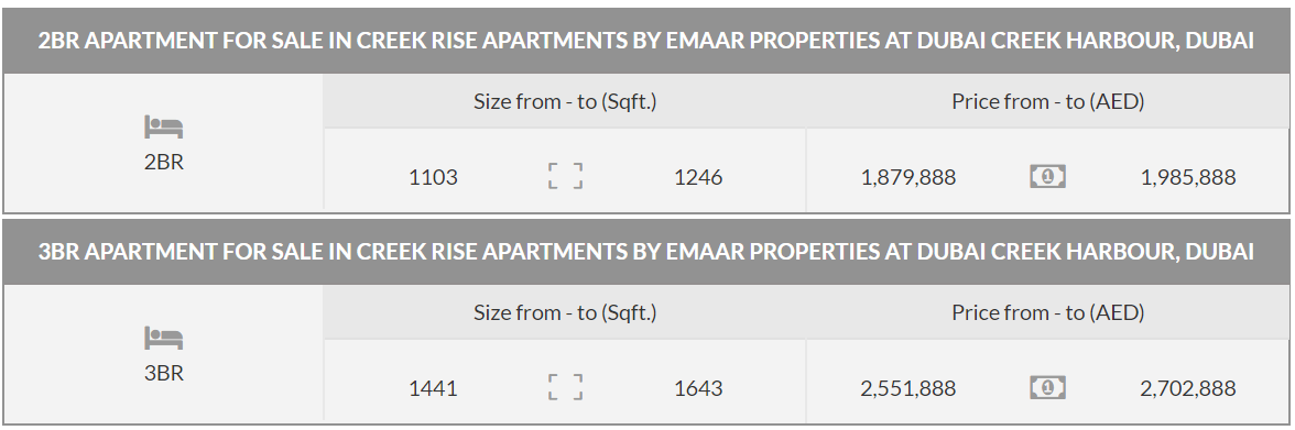 Creek Rise by Emaar Properties is a luxury apartment project in Dubai Creek Harbour offering one, two and three bedroom premium apartments. The magnificent tower provides elegant homes which boast of stunning views of the Dubai Skyline and The Tower. Residents can enjoy sheer solace in Creek Rise’s modern living spaces, set against an exquisite and outstanding metropolis.