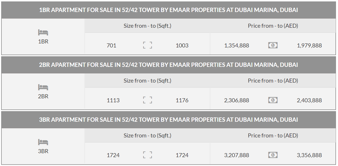 52/42 Tower by Emaar Properties is a luxury residential apartment in Dubai Marina which offers spectacular views over the area of Dubai Marina and The Arabian Sea. Aside from picturesque beachfront views, the high-end luxury tower offers one, two, three and four bedrooms apartments. 52/42 Tower Dubai Marina also provides world-class amenities and facilities like infinity pools, the podium deck, and the ultimate club facilities. 52/42 Tower Dubai Marina is in close proximity to Dubai Metro and Tram and is accessible from Sheikh Zayed Road and the upcoming blue water island bridge.  The residential tower offers spacious living at an affordable price that starts at AED 1,273,888.